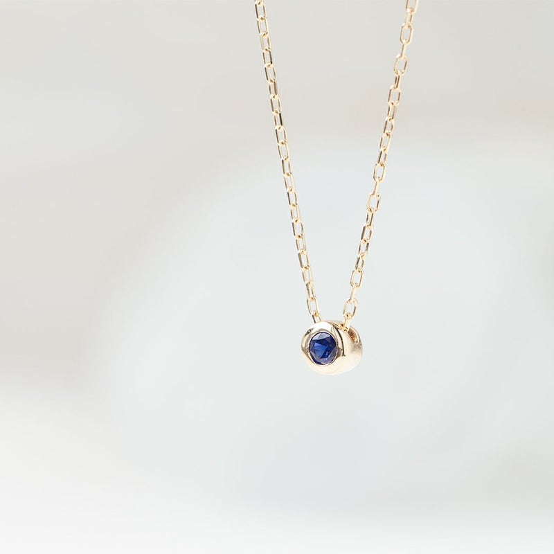 爪のないスッキリとしたフクリン枠にサファイアを1石セットしたネックレス。