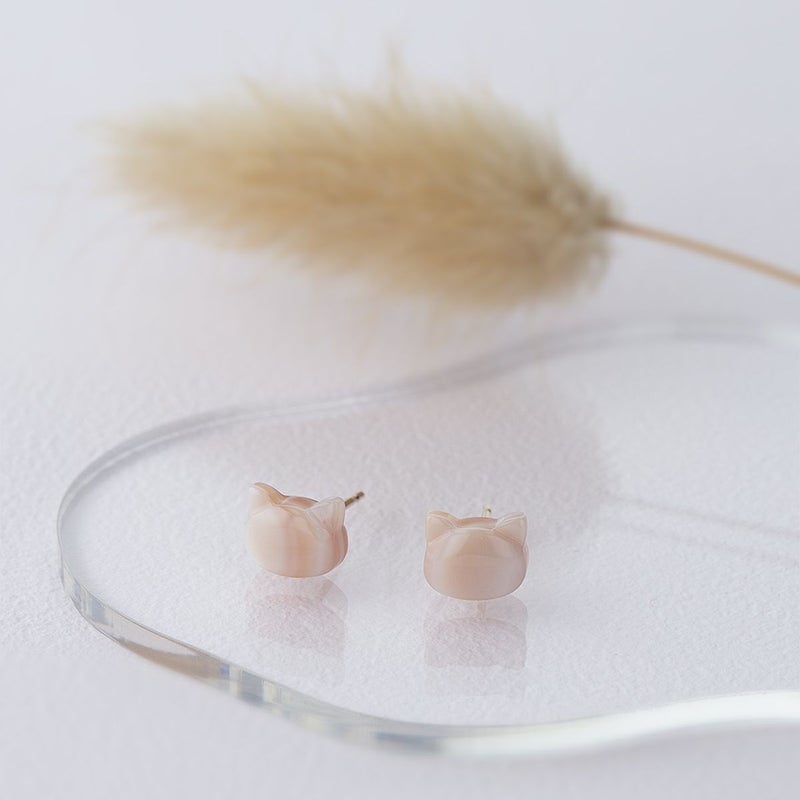 桜色のピンクシェルを使用した、ぷっくり丸顔の猫モチーフスタッドピアス。
