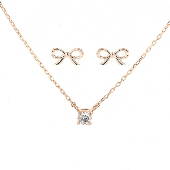 K10ピンクゴールドの優しい輝きが肌になじむ、リボンモチーフのピアスとダイヤモンドネックレスのセット。